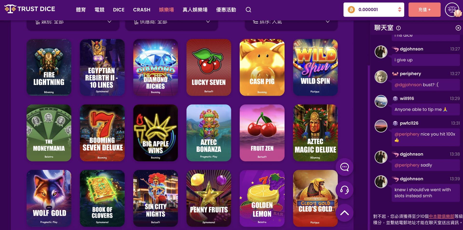 - Máy Slot Độc Đáo: TrustDice có hơn 2.000 trò chơi máy slot với nhiều chủ đề khác nhau. Từ các máy slot cổ điển cho đến các máy slot video hiện đại với nhiều vòng quay miễn phí và tính năng bonus hấp dẫn, người chơi sẽ không bao giờ cảm thấy nhàm chán.